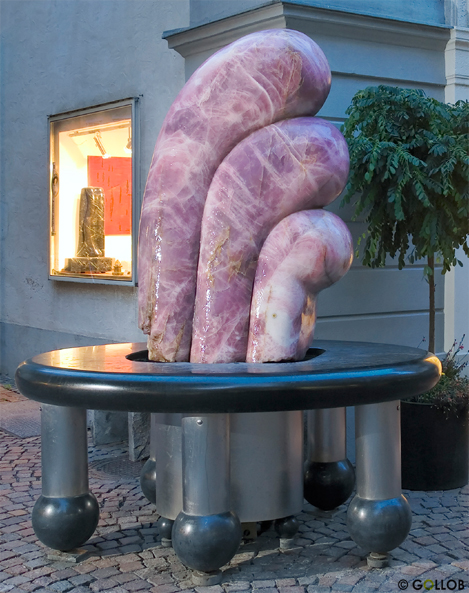 "Vater, Mutter, Kind..." - Geborgenheit und Herausforderung. Der Familie, als wichtigste Zelle einer zukunftsorientierten Gesellschaft hat Christian Gollob mit diesem Brunnenkunstwerk ein Denkmal gesetzt. Gleichzeitig darf es auch als ein Mahnmal verstanden werden. Als Mahnung, den Wert der Familie als tragende Basis einer gesunden Gesellschaft in ihrer ganzen Bedeutung wahrzunehmen. "Vater, Mutter, Kind...", bildhauerisch geformt aus dem wohl größten bisher gefundenen Lavendel-Rosenquarz. Der Rosenquarz ist als wichtigstes Mitglied der Quarzfamilie der Grundstein für das Herzchakra, er vermittelt dynamische Intensität und Heilkraft, aber auch die beruhigende Schwingung seines sanften Rosa Farbtones (ausgehöhlt und von innen beleuchtet erstrahlt dieser Rosenquarzbrunnen in einem besonders mystischen Licht.) Möge das Brunnenkunstwerk mit seiner Schwingung und mit seiner archaischen Kraft möglichst viele Herzen erreichen.