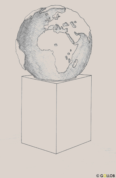 Kugel gearbeitet in schwarz-grauem Dolomitgestein. Kontinente in Silberbronze aufgearbeitet. Podest in Edelstahl. Die Oberfläche ist der Geomorphologie ziemlich wahrheitsgetreu nachempfunden. Aufgestellt in der Disponentenhalle der Spedition Frikus in Zettling.